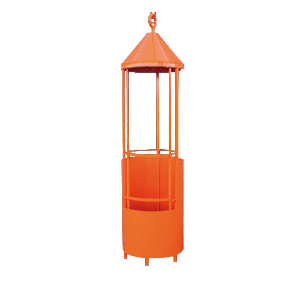 A compact work basket designed for one person, suitable for suspension from a crane hook. Features easy access and full-perimeter safety guardrails for enhanced protection. Its slim, space-saving design allows for convenient use at any time. Supplied complete with safety rope and manufactured in accordance with occupational safety regulations set by relevant trade associations.